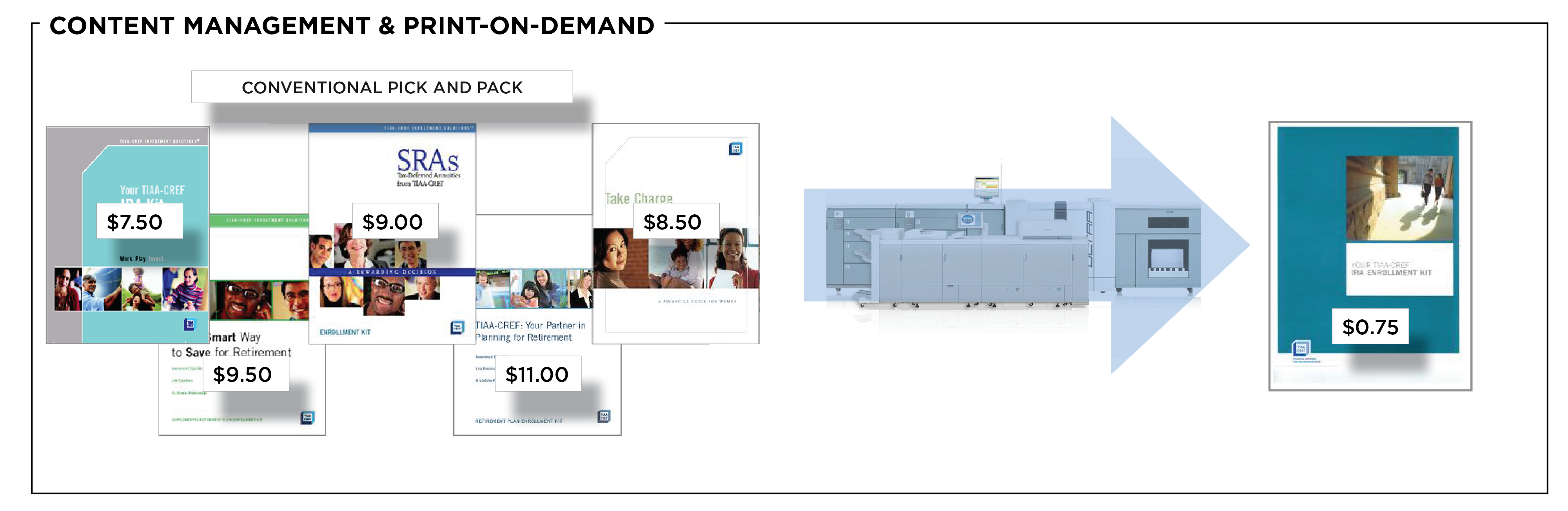 As an insurance company, TIAA-CREF’s enrollment process was arduous and time-consuming. Each kit carried with it as many as 25 inserts, making it equally challenging to produce. It was also very expensive.
