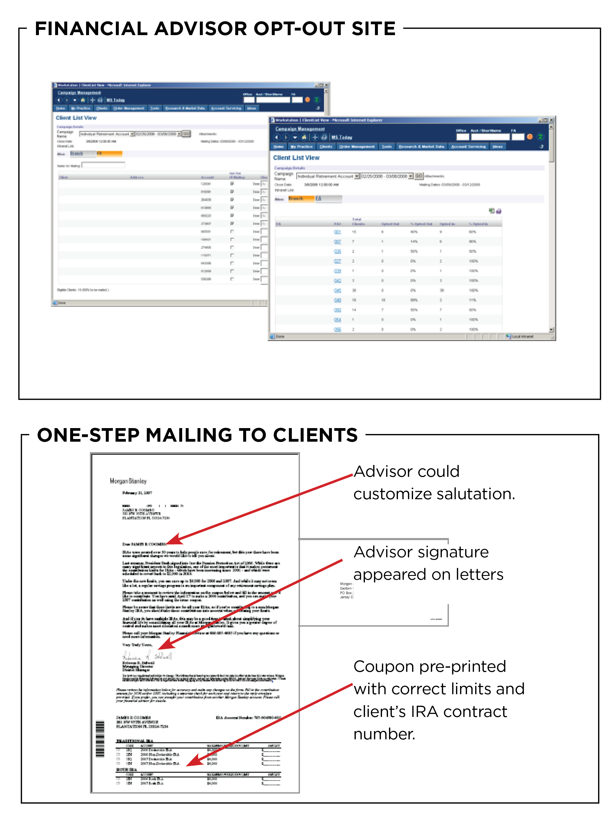 In 2007, we developed a pilot program and tested it in 4 districts. Client names were loaded into a browser-based application which FAs used to opt-out clients from the mailing. Clients were then mailed a single letter with a pre-filled perf-off coupon attached.