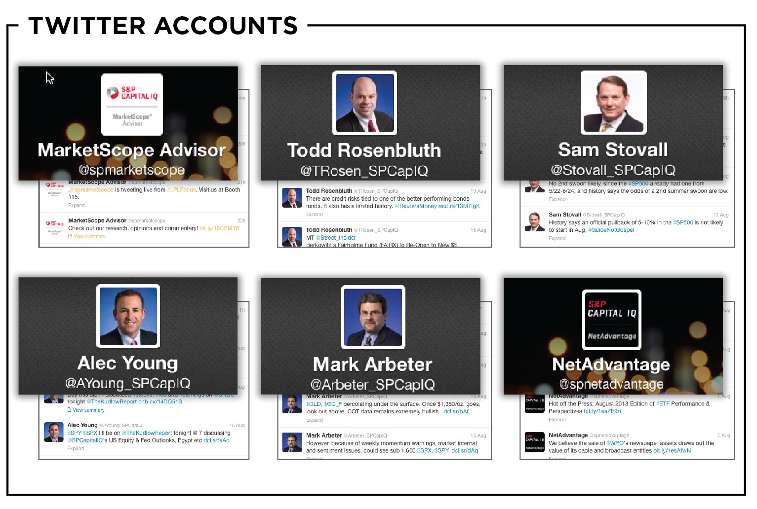 We began slowly with several corporate Twitter accounts and then expanded our footprint to include several of our more well-known analysts and strategists. Since the context of Twitter was a personal one, we felt that individual analysts would have more impact than a corporate account, which could easily be seen as just another marketing pitch.