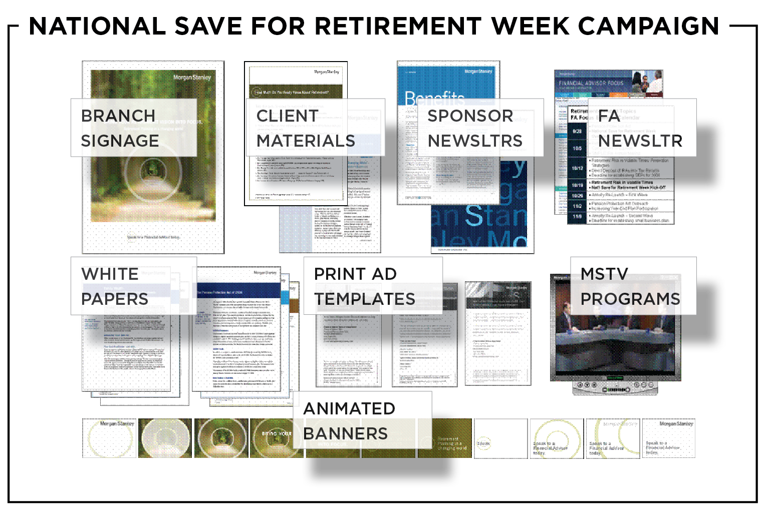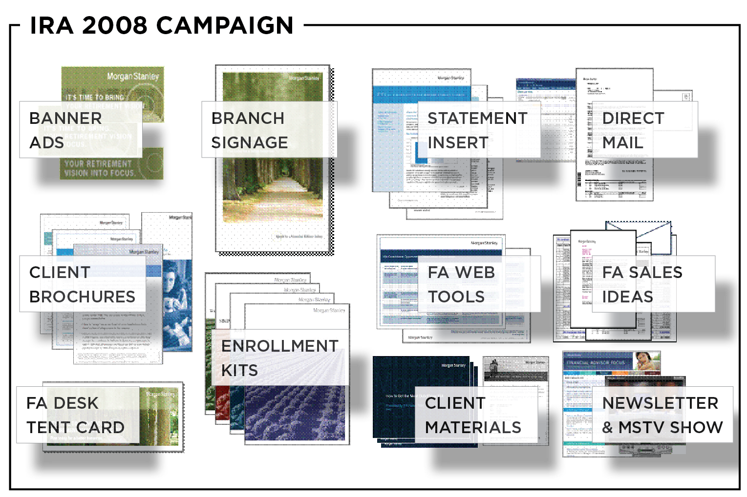 In addition to business as usual support, we mounted several large-scale campaigns designed to create a 360-degree experience for financial advisors and their clients. You can see examples of such campaigns on this page. The IRA 2008 campaign, for instance, was composed of ads, signage, collateral, sales tools and other materials, all centered around the theme, “It’s time to bring your retirement vision into focus.”