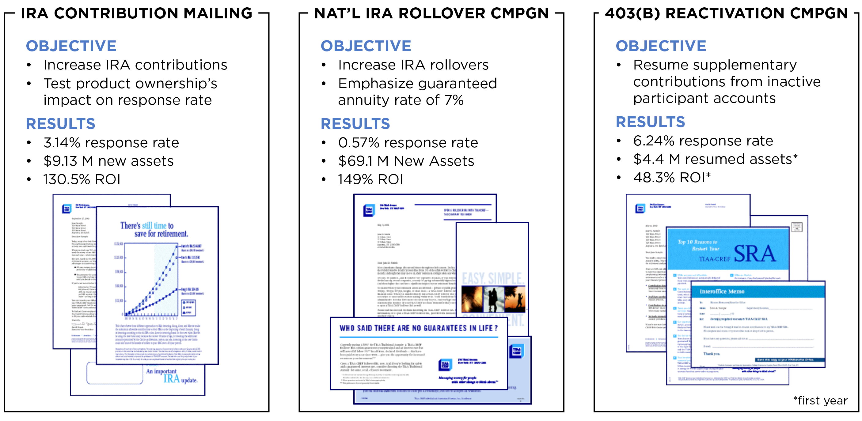 TIAA-CREF tended to favor large-scale mailings to most of its 3 million participant base, despite the fact that only a clearly defined segment of that population was eligible or potentially interested in a particular offering. My team conducted exhaustive research into the participant base to identify subsegments based on age, contribution level, products owned and other demographic factors. These smaller mailings were highly efficient and tremendously effective in driving assets under management for the firm.